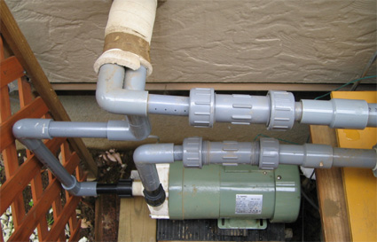 こんな感じの配管を作成しました.さらに,DIYで防音の壁と屋根をつけました.一応,何とか使えそうな感じです.しばらく,これで様子見です.