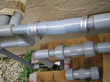なかなかさんのご意見を受けて,配管の一部を塩ビ管からホースにしました.写真の部分は,つなぎ手をそのままホースにしたので,ほとんど手がかかっていません.もう1カ所,ポンプへの入り口もホースにしました.そちらは,今までの配管を切断して作り直しました.これのおかげで,家の壁に伝わるような振動はおさまりました.考えてみれば,塩ビ管だけだと振動が大きいのは,理解できますね.