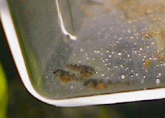 10月15日 更新をさぼっておりましたが,ステルバイは1週間に一度くらいのペースで産卵しています.産卵個数は1回に10個程度,前面のガラスを中心に,時々水草や水温計に卵をつけます.多くの場合は2粒でセットになっているので,2個ずつ産み落とすものと思います.初めに繁殖に成功した3匹の次の世代は,現在,産卵ケース内にいます.大きさは,概ね7〜8ミリ程度で,イトミミズを食べています.一緒の産卵ケースにその次の大きさの5ミリくらいのが3匹くらいいます.こちらも,イトミミズを食べられるようになってきました.あと,それより小さいのが数匹...最近,ブラインシュリンプをやらずに,人口飼料にしています.単なる,飼育者の怠慢です.ブラインリーフと言う人口飼料を買ってみました.高いわりに...やっぱり,ブラインシュリンプにすれば良かったです.これは,おそらくグッピーなどの稚魚飼育用のようです.何はともあれ,ある程度の大きさになった時点で,イトミミズと格闘してもらいます.