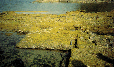 これは,沖縄で撮った写真です.何を見ていただきたいかと言うと,石の写真です.石材にしているもので,切り取った後がわかります.これはビーチロックと呼ばれているものです.で,この写真で言いたいことは,普通の海岸と比べてください.砂浜と言われている海岸は,常に砂が動くような状態で,砂遊びができます.ところが,ここは硬い岩石になってしまっています.このような,ビーチロックができるのは暖かいところに限られているそうです.別に古い岩石が露出しているのではありません.コカコーラの瓶がこの中に閉じ込められていたこともあるそうな...石灰質(化学組成はCaCO3)の鉱物の結晶化によってかたまるのでした.石灰質の成分は非常に早い時間で変質を繰り返すことができるのがお分かりいただけますか?