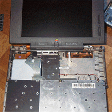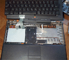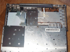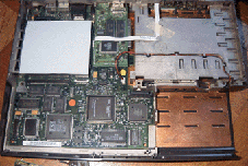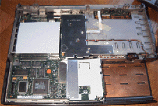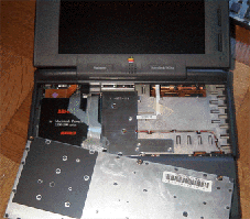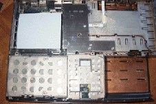 キーボードも外しました.左下が,HDDです.その右はバッテリーが入るところです.その上がフロッピードライブ.左端の白いところは,PCカード装着部です.