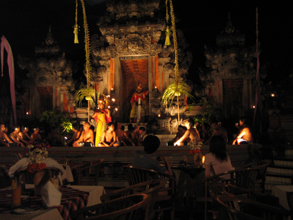 バリと言えば,有名なのはケチャクダンスでしょう.ずいぶんと大勢のダンサー(老若男女)が披露してくれました.これは,ホテルの中の食事時に撮った写真ですが,お客さんの割には大勢で踊ってくれて感激でした.