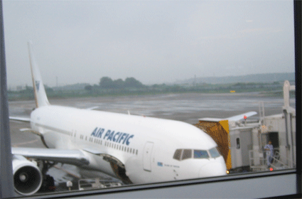 成田出発!まだ梅雨空でした.7月も下旬なのに,水害のニュースを横目についに出発の時が来ました.フィジーに行く飛行機は限られています.一番便利なのは写真のAIR PACIFIC(大胆な名前ですが,フィジーの国際線です)です.これから成田を出発です.ところで,エアパシフィックのチェックインは16時半からだそうです.19時のフライトですが,あまり早めに行くと待ち時間が長いです.適度な時間に成田到着したいものですね.