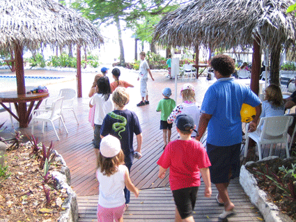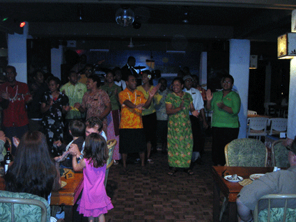 小さい子供にはプールもあります.プールの向こうが食事を食べる場所になります.そして,その右手にはバーがあります.いつも,ハッピーアワーには飲んでいました.飲み物が半額になります.私はだいたいビールを飲んでいました.フィジービター,フィジーゴールドってところですね.やはり現地では現地の飲み物でノドを癒すと言うのは,私の旅行の鉄則です.ハッピーアワーの時にはプールサイドやバーに大勢集まっていました.この頃になると,子供のディナーも始まります.
