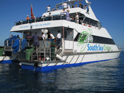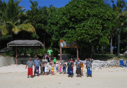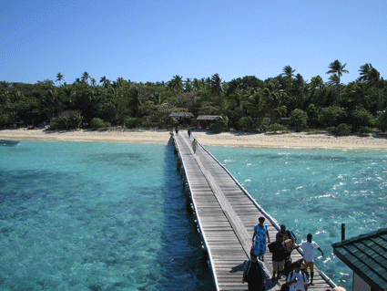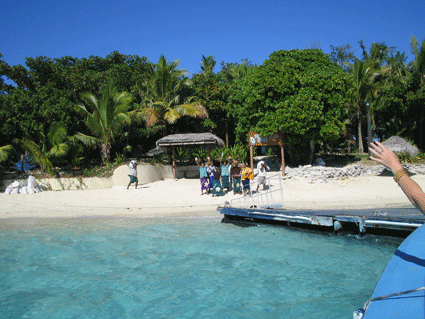 元々,船は周遊船ですので,いろいろな島へ寄って帰ります(詳細には覚えていませんが,10島くらいは寄っていたと思います).こちらは,日本人には有名なマナ島です.ここは大きな島で,おそらく珊瑚礁を少し掘って桟橋まで水深を深くしてあるようです.桟橋に直接船を着けることが出来ます.大勢の観光客が待っていました.一説によるとオーナーが日本人とか?!ですので,かなり日本語でもいけると思います.トレジャーアイランドも以前は日本人のスタッフがいたと聞いています.ここでも,ギターを持って歌でお出迎えでした.