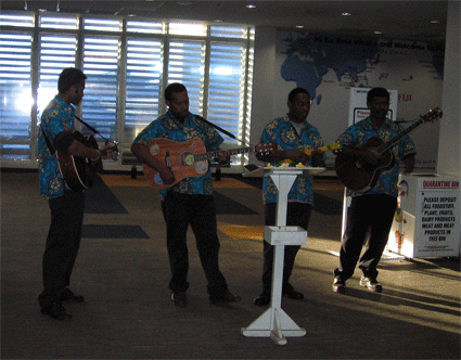 うーん,眠い!でも,到着して,嬉しいぞ.早朝の到着にもかかわらず,歌でお出迎え!しかも,このスタイルが,いかにもフィジーを思わせてくれます.入国審査は少し並びますが,いたって簡単.もしかすると,一言もしゃべらなくても通りそうです(笑).最近は米国などうるさい国もありますが,あまり英語力の心配は要りません.その後,荷物を受け取って,税関審査(食べ物などの申告)をすれば,もう入国完了です.南半球の国は,食べ物などの持ち込みは基本的に禁じています.個人的な意見ですが,折角外国に行くのですから,その国の食べ物を楽しみましょう.