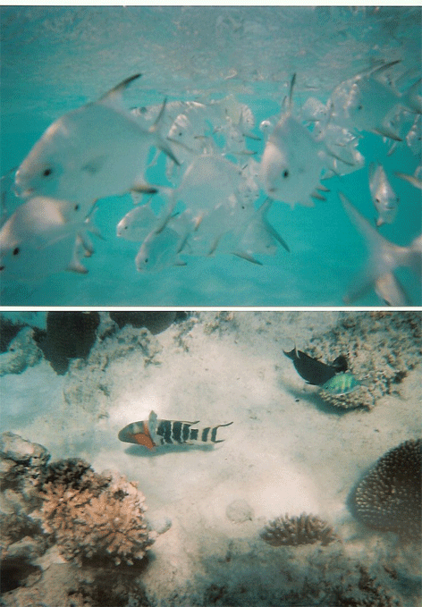 シュノーケリングをするとこんな感じです.使い捨てカメラの写真なので,写りが悪くて済みません.上の写真は砂浜から海水に入ったところの写真で,こんな感じで魚が群れています.とにかく魚が大量にいました.パンを持って行くと,怖いくらい寄ってきます.本当はカヌーで砂州まで行きたかったのですが,風が強くて子供と2人,3人乗りではとても渡れそうにありませんでした.島から歩いていけるくらいの所に,2x2メートルくらいの人工の島が出来ていて,そこの周りにはサンゴがいっぱい見られ(下の写真),子供にも安心です.小学校の高学年で背が届く感じです.普通の状態では,リーフの中は波もそれ程にならないし,強い流れも発生しないようです.
