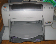 2005年の春まで使用中のプリンタです.HP 970cxiと言う機種です.ご自身でお調べください.マニュアルドライバ等は購入時のままあります.USBとシリアルがあります.両面印刷も可能です.その部品ももちろんセットです.オマケとして,インクの新品を黒(2本)カラー(2本)をお付けします.その代わり,1万円程度を考えています.HPはインクが高いので,ご理解ください.比較的美品だと思っています.